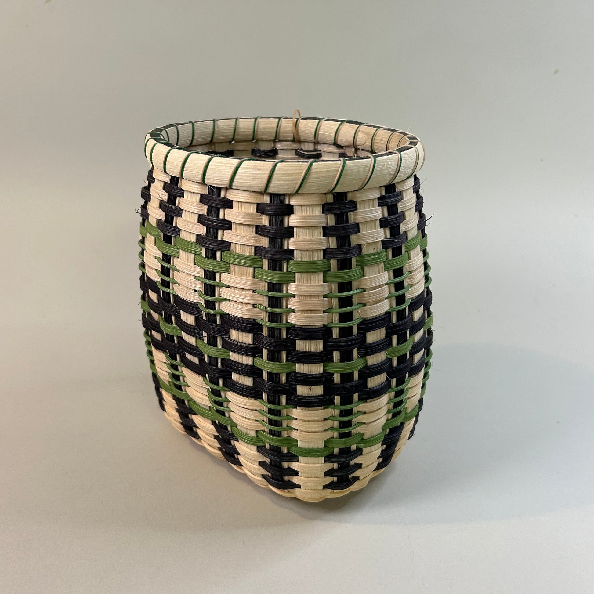A bold basket woven with black and bright green dyed reed accents. This basket features a single lashing with two colors of waxed linen for a modern feel.